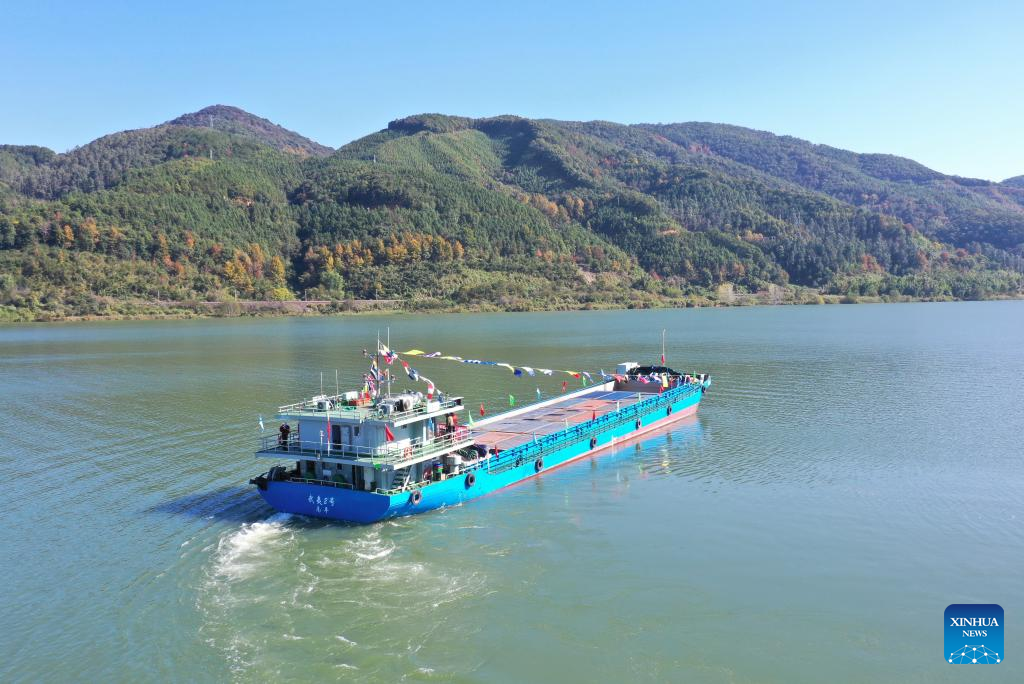 This aerial photo shows a new energy cargo ship sailing in the Minjiang River in southeast China's Fujian Province on Dec. 18, 2022. (Xinhua/Lin Shanchuan)
