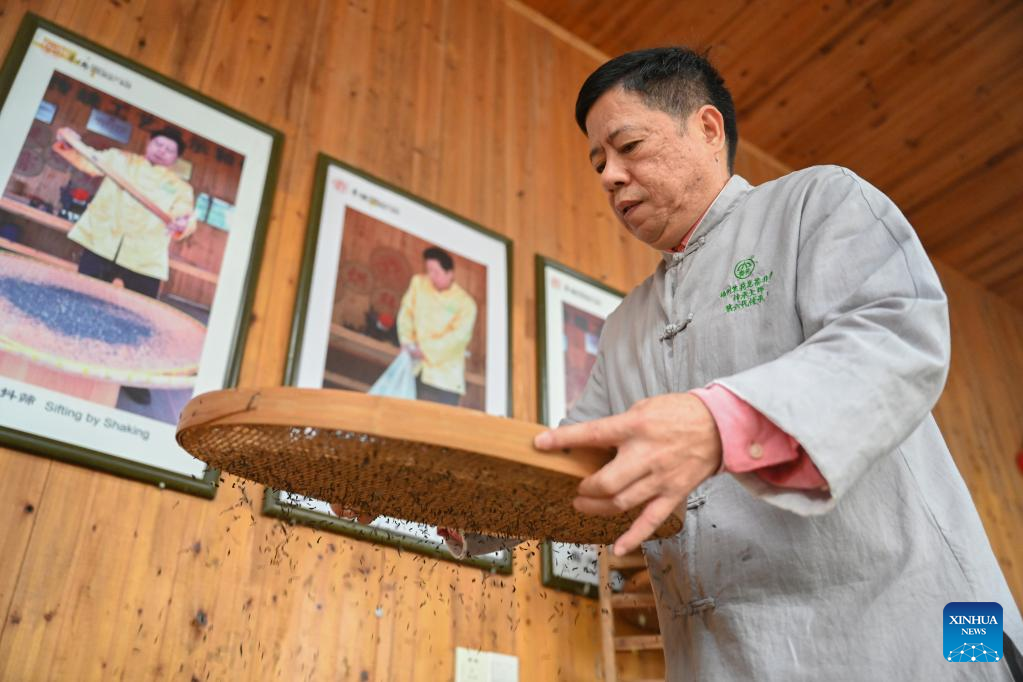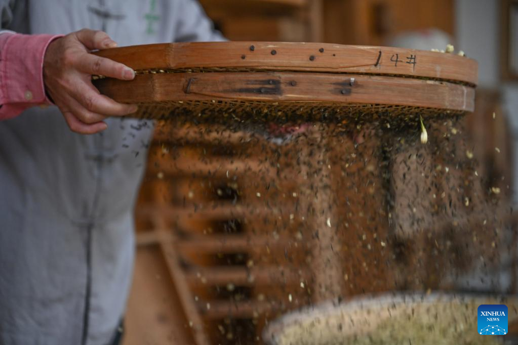 Fu Tianfu, a master of tea-scenting techniques, separates jasmine buds from tea leaves with a special sifter at a tea workshop in Fuzhou, southeast China's Fujian Province, on Dec. 16, 2022. (Xinhua/Zhou Yi)