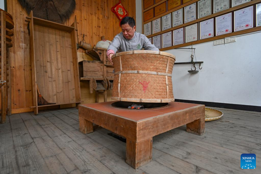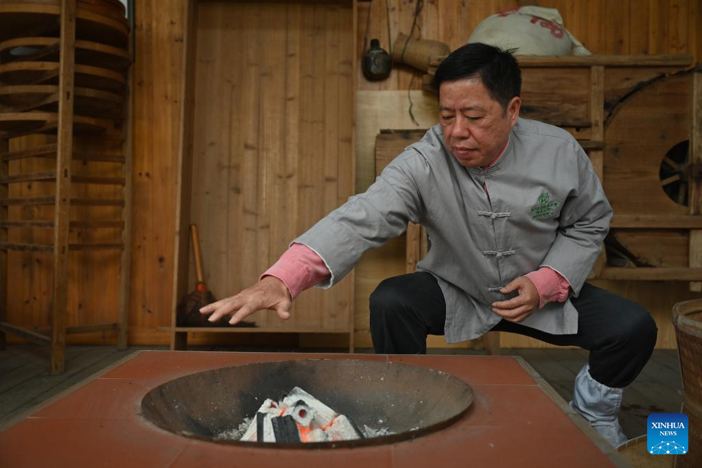 Fu Tianfu, a master of tea-scenting techniques, roasts tea leaves at a tea workshop in Fuzhou, southeast China's Fujian Province, on Dec. 16, 2022. (Xinhua/Zhou Yi)