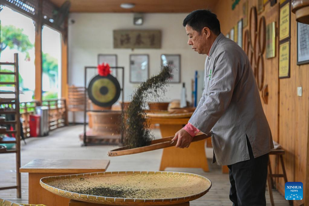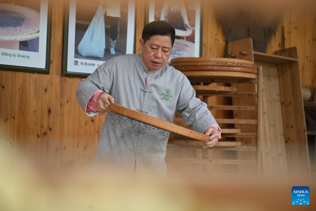 Fu Tianfu, a master of tea-scenting techniques, separates fractured tea leaves with a winnow at a tea workshop in Fuzhou, southeast China's Fujian Province, on Dec. 16, 2022. (Xinhua/Zhou Yi)