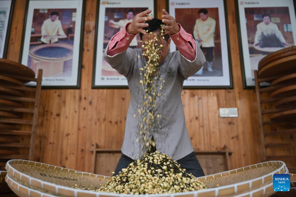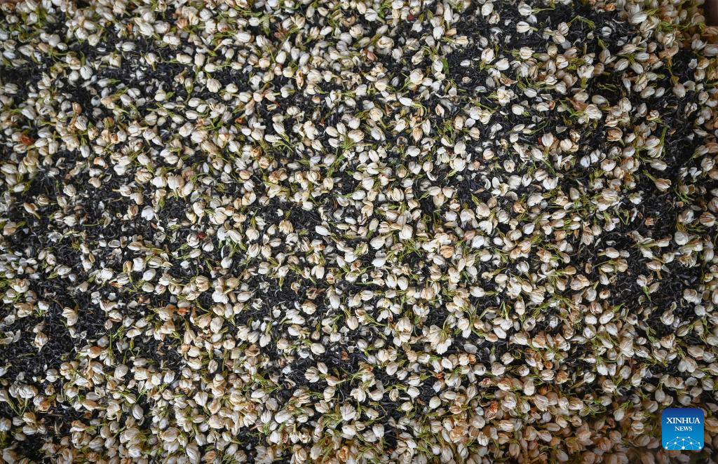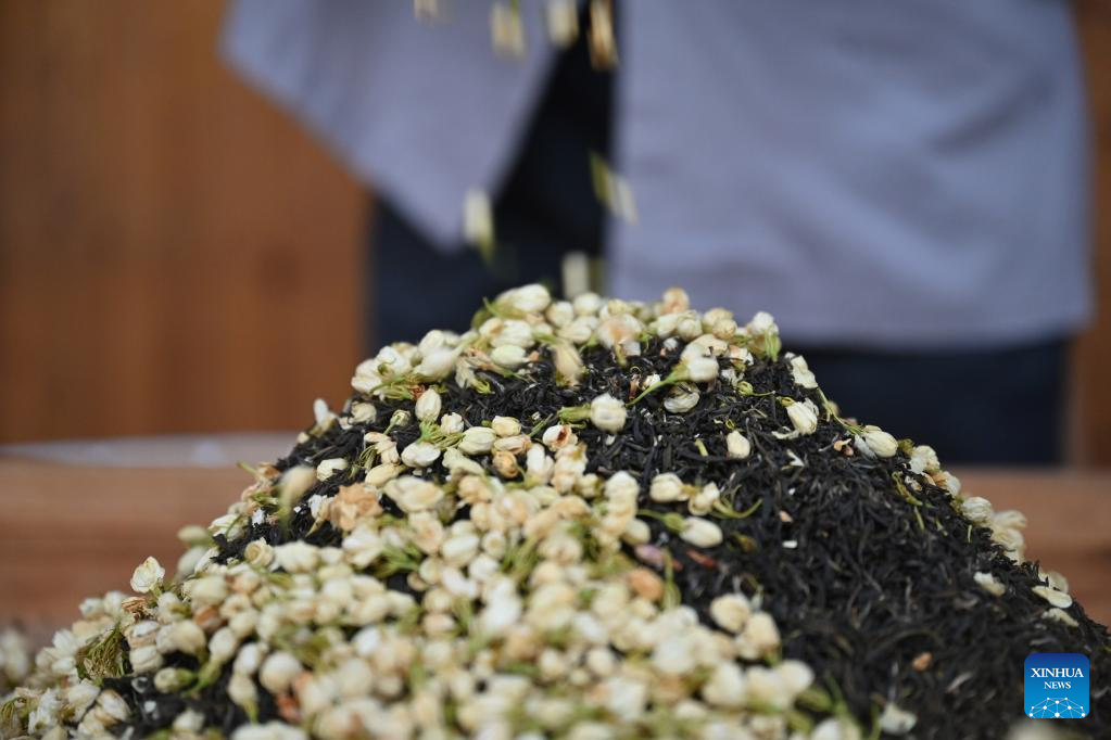 Fu Tianfu, a master of tea-scenting techniques, scents tea leaves with jasmine buds at a tea workshop in Fuzhou, southeast China's Fujian Province, on Dec. 16, 2022. (Xinhua/Zhou Yi)