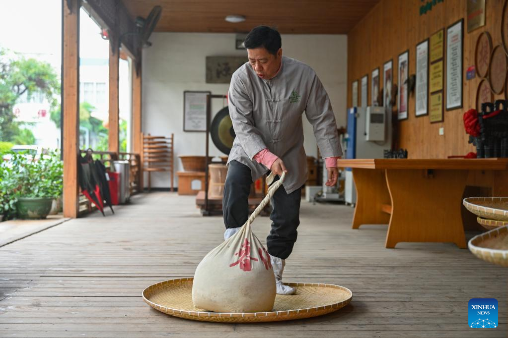 Fu Tianfu, a master of tea-scenting techniques, processes a bag of tea leaves by gently treading at a tea workshop in Fuzhou, southeast China's Fujian Province, on Dec. 16, 2022. (Xinhua/Zhou Yi)