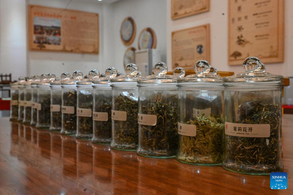 This photo taken on Dec. 16, 2022 shows samples of different types of jasmine tea displayed at a tea workshop in Fuzhou, southeast China's Fujian Province. (Xinhua/Zhou Yi)
