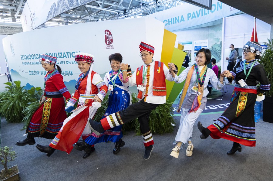 Staff members wearing ethnic costumes perform at the China Pavilion during the second phase of the 15th meeting of the Conference of the Parties to the UN Convention on Biological Diversity (COP15) in Montreal, Canada, Dec. 15, 2022. (Photo by Zou Zheng/Xinhua)