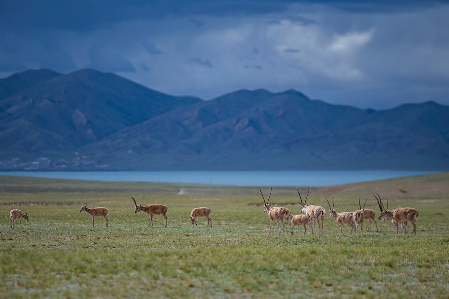 Photo taken on July 11, 2022 shows Tibetan antelopes at the Qiangtang National Nature Reserve in southwest China's Tibet Autonomous Region. (Xinhua/Sun Fei)