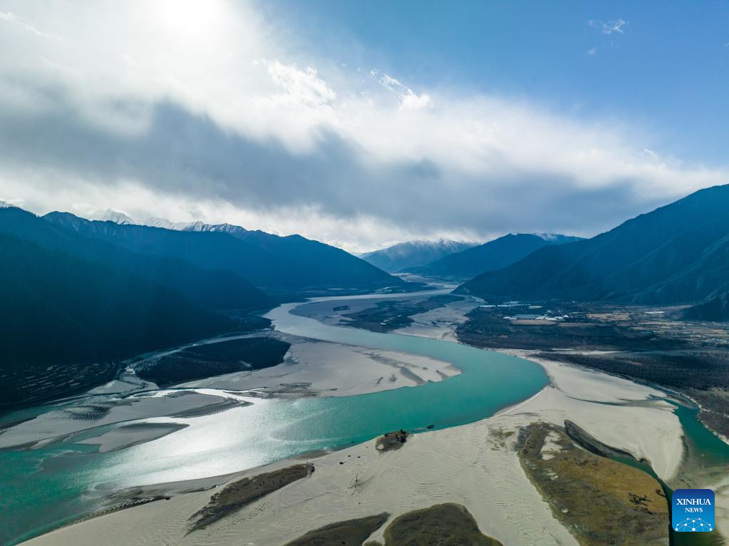 This aerial photo taken on Dec. 18, 2022 shows the scenery of Mainling section of the Yarlung Zangbo River in Mainling County of Nyingchi, southwest China's Tibet Autonomous Region. (Photo by Dong Zhixiong/Xinhua)
