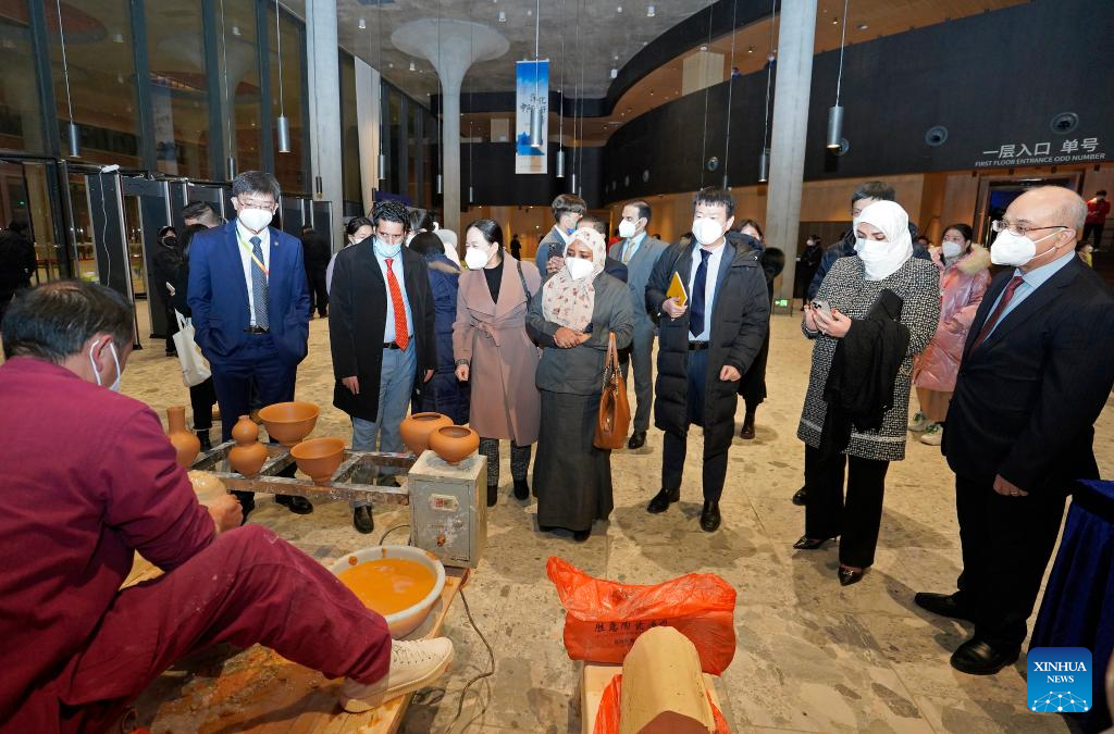 Guests visit an intangible cultural heritage exhibition during the fifth Arabic Arts Festival in Jingdezhen, east China's Jiangxi Province, Dec. 19, 2022. (Photo by Lei Zhi/Xinhua)