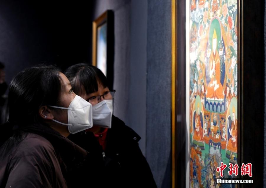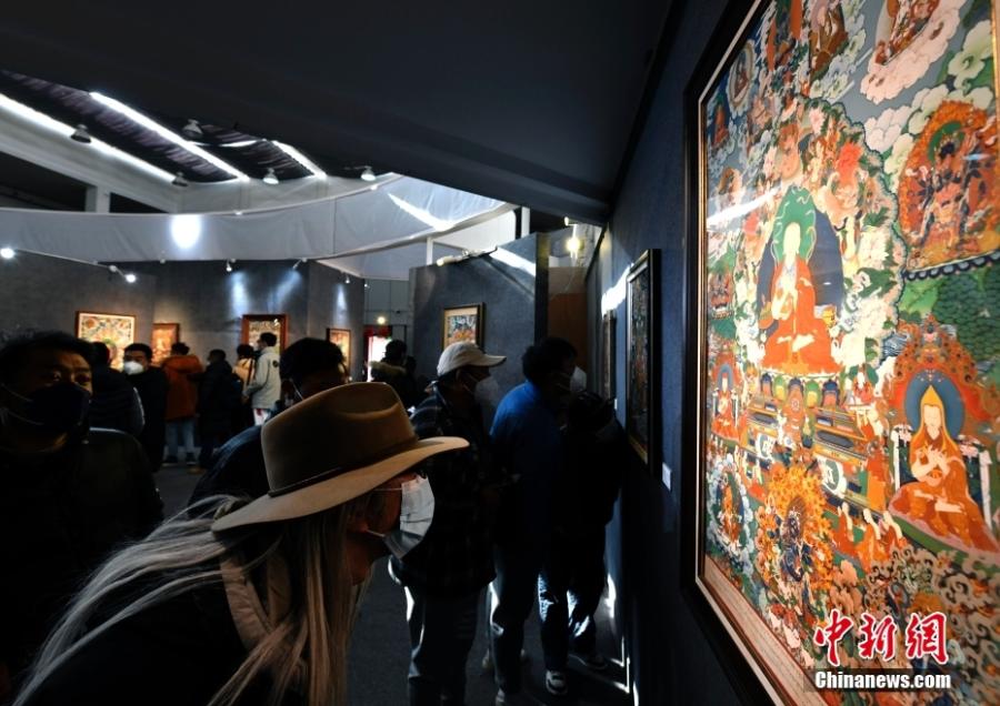 Visitors view a Thangka painting at the 8th Thangka painting exhibition in Lhasa, southwest China's Tibet Autonomous Region, Dec. 19, 2022. (Photo: China News Service/Li Lin)