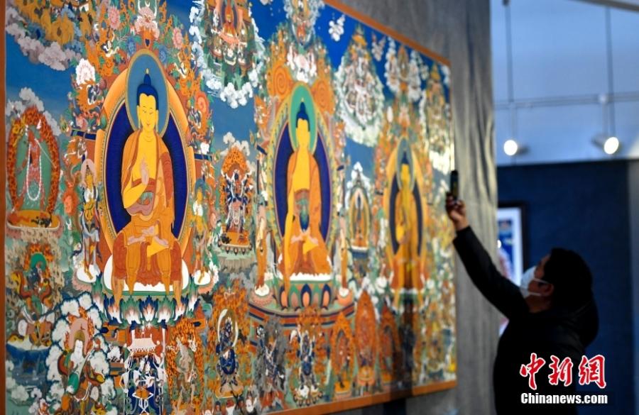 A visitor takes photos of a Thangka painting at the 8th Thangka painting exhibition in Lhasa, southwest China's Tibet Autonomous Region, Dec. 19, 2022. (Photo: China News Service/Li Lin)