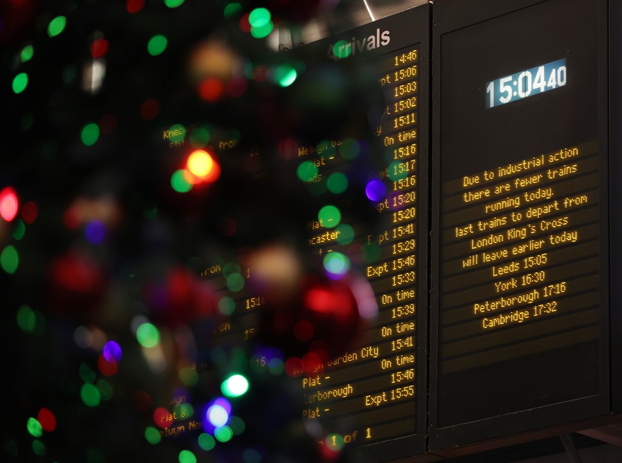 A notice of strike is seen next to a Christmas tree at King's Cross railway station in London, Britain, Dec. 17, 2022. (Photo/Xinhua)