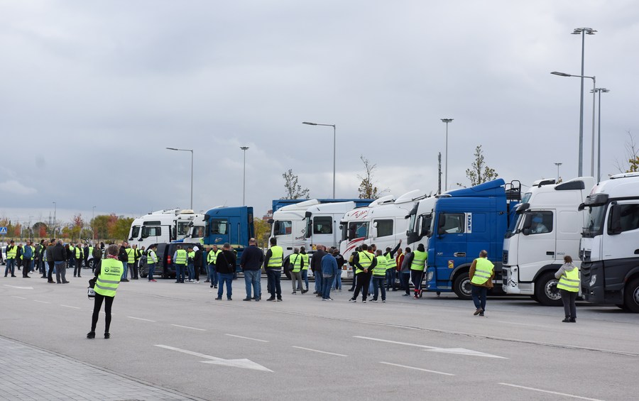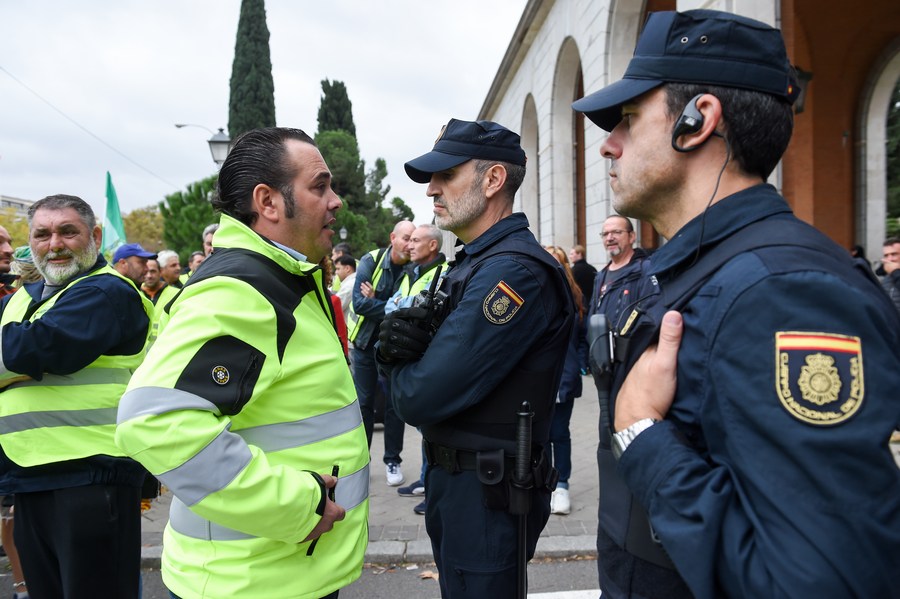 Truck drivers take part in a protest in Madrid, Spain, on Nov. 14, 2022. (Photo by Gustavo Valiente/Xinhua)