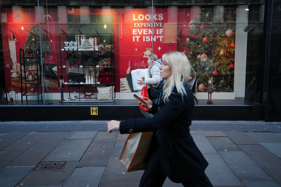 People walk past a promotional sign in Manchester, Britain, Dec. 13, 2022. Soaring inflation has forced many households to reassess their spending for Christmas this year. (Photo by Jon Super/Xinhua)