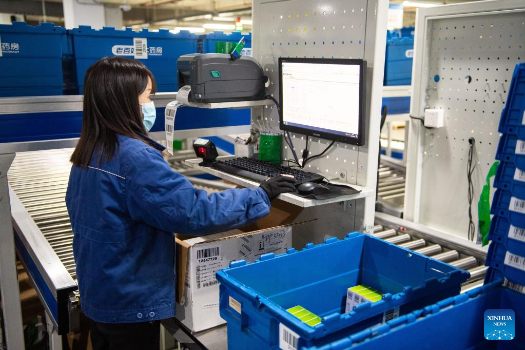 A staff member registers information of medicines at a logistics center of a pharmacy in Kaifu District of Changsha, central China's Hunan Province, Dec. 20, 2022. (Xinhua/Chen Sihan)