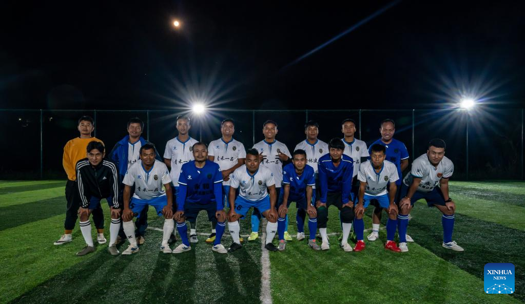Members of the football teams of Longnai Village and Yonghe Village pose for a group photo after a match in Cangyuan Wa Autonomous County of southwest China's Yunnan Province, Dec. 7, 2022. (Xinhua/Jiang Wenyao)