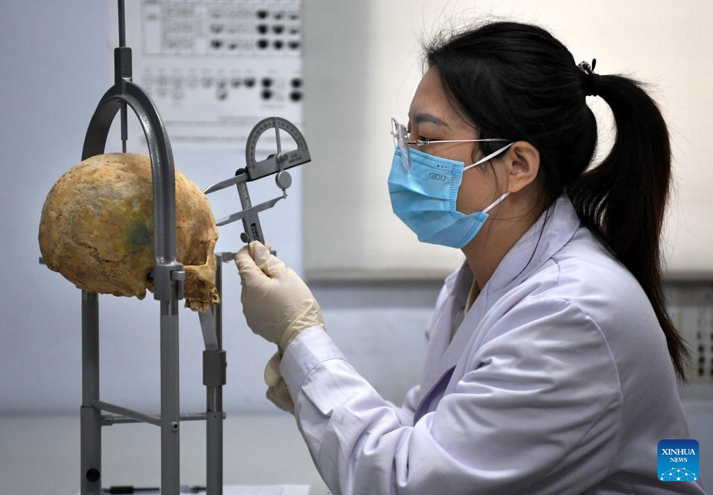 Li Yanzhen meaures a human skull at Henan Institute of Cultural Relics and Archaeology in Zhengzhou, central China's Henan Province, Nov. 30, 2022. (Xinhua/Li An)