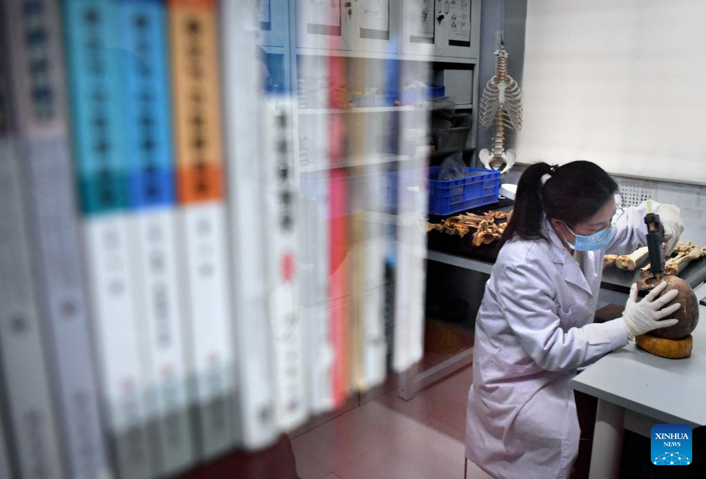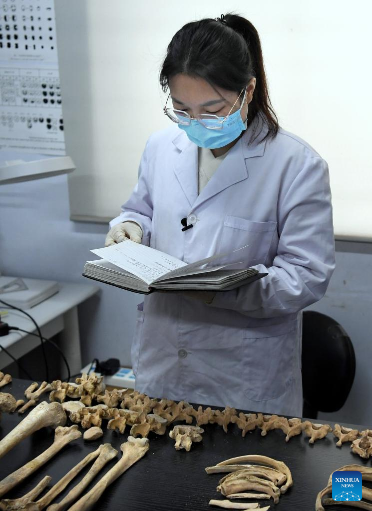 Li Yanzhen compares human bones at Henan Institute of Cultural Relics and Archaeology in Zhengzhou, central China's Henan Province, Nov. 30, 2022. (Xinhua/Li An)