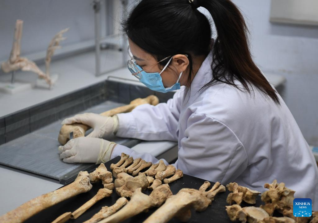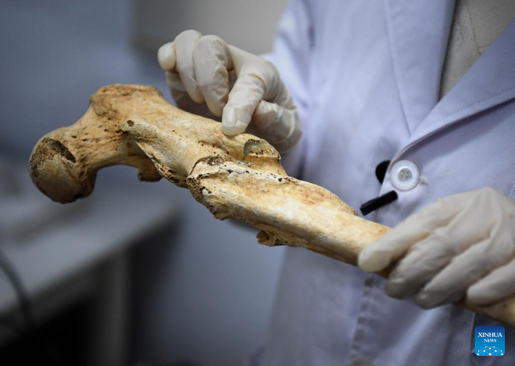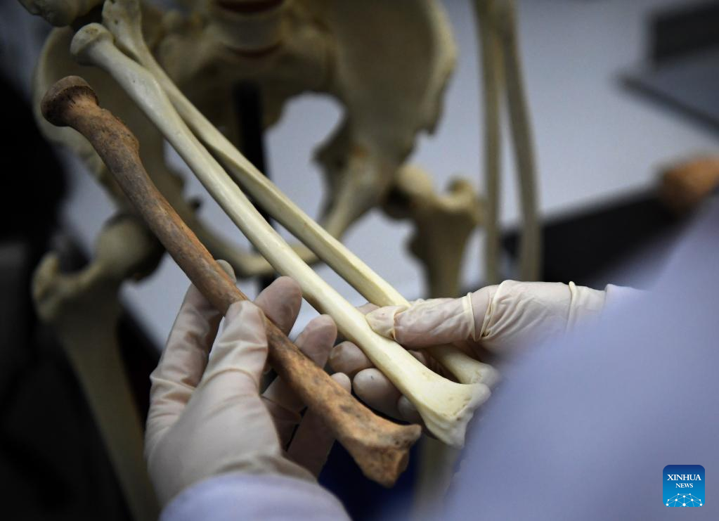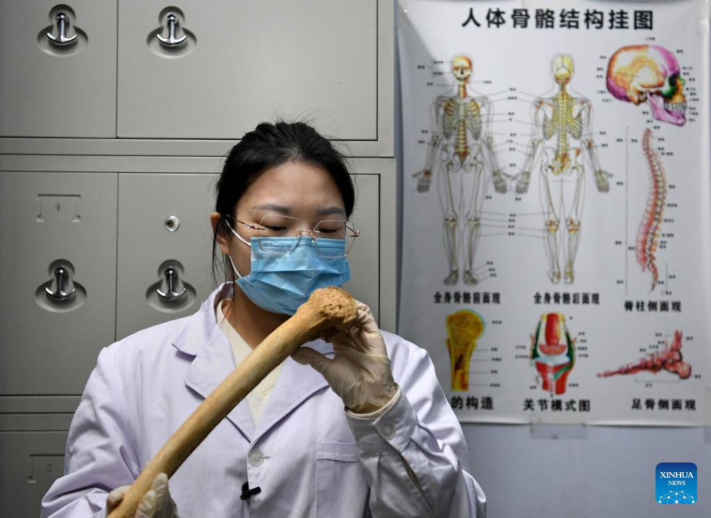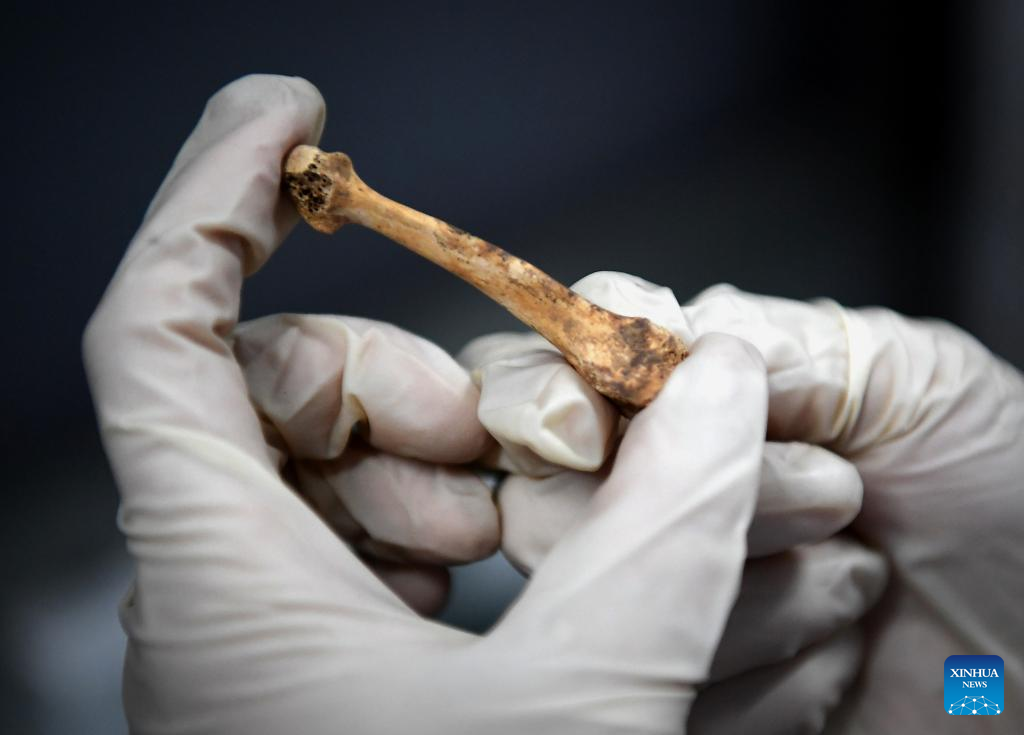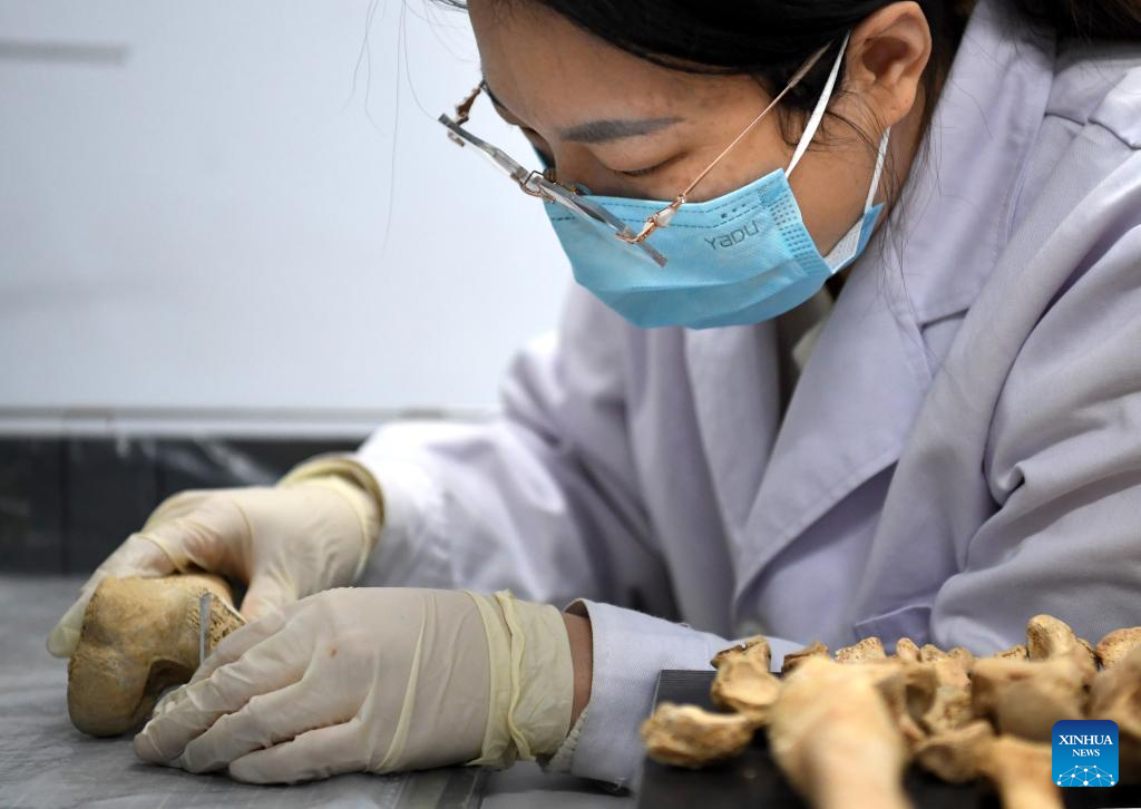 Li Yanzhen observes a human bone at Henan Institute of Cultural Relics and Archaeology in Zhengzhou, central China's Henan Province, Nov. 30, 2022. (Xinhua/Li An)