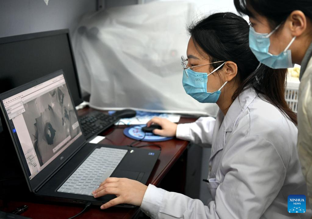 Li Yanzhen details the image of a skull after 3D scanning at Henan Institute of Cultural Relics and Archaeology in Zhengzhou, central China's Henan Province, Nov. 30, 2022. (Xinhua/Li An)