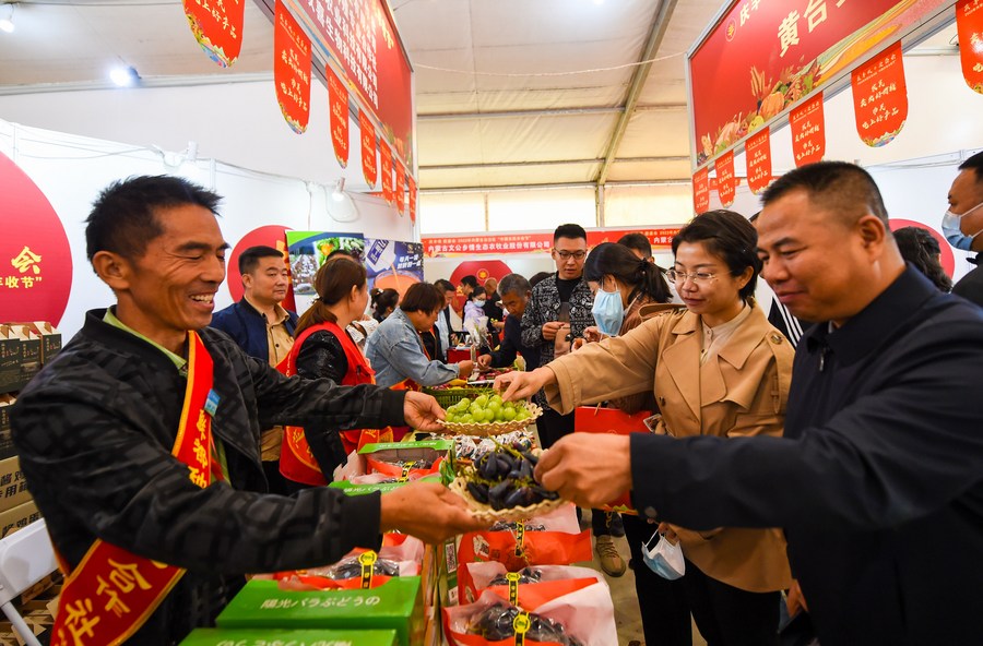 Visitors taste grapes during an activity celebrating the Chinese farmers' harvest festival in Hohhot, north China's Inner Mongolia Autonomous Region, Sept. 19, 2022. (Xinhua/Peng Yuan)