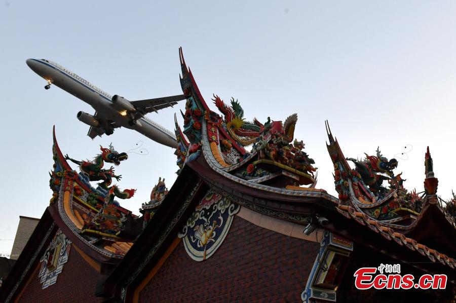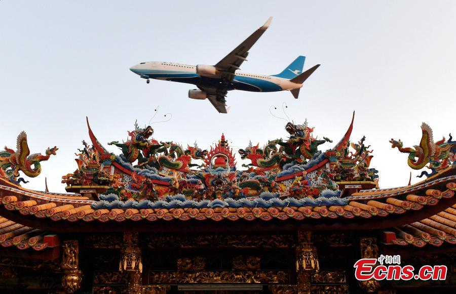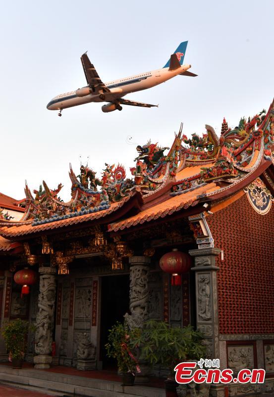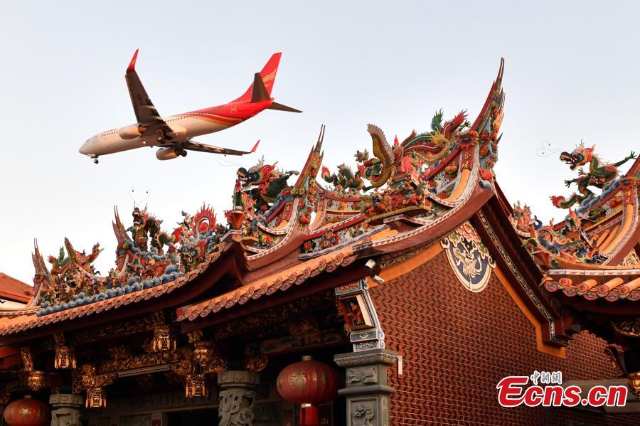 An airplane flies over Qingshui Palace, a landmark architecture in Xiamen, east China's Fujian Province, Dec. 20, 2022. (Photo: China News Service/Lv Ming)