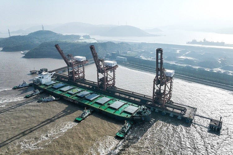 A bulk carrier from the port of Itaguai, Brazil docks at a terminal in Putuo district, Zhoushan, east China's Zhejiang province, December 2022. The vessel will visit the Taicang port of Jiangsu province after 92,134 tons of ore fines is unloaded from it. (People's Daily Online/Yao Feng)
