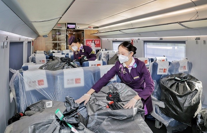 Attendants inspect and check express delivery parcels on a high-speed train from Quzhou, east China's Zhejiang province to Shanghai, November 2022. (People's Daily Online/Zhou Wei)