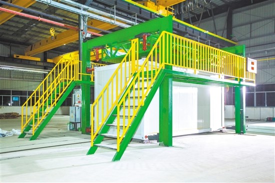 A "mobile house" manufactured by China Green Container Co., Ltd., a container house manufacturer based in south China's Guangdong province, is being tested for water leaks. (Photo/Jiangmen Daily)