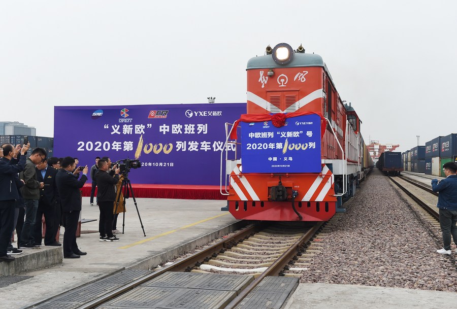 A freight train carrying 100 TEUs of goods departs from Yiwu, east China's Zhejiang Province, for Minsk in Belarus, Oct. 21, 2020, marking the 1,000th trip by China-Europe cargo trains in the province this year. (Photo by Gong Xianming/Xinhua)
