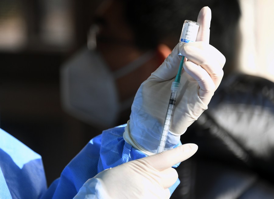 A medical staff prepares before administering a second booster dose of COVID-19 vaccine for a resident through nose at a temporary vaccination site in Haidian District, Beijing, capital of China, Dec. 17, 2022. (Xinhua/Ren Chao)