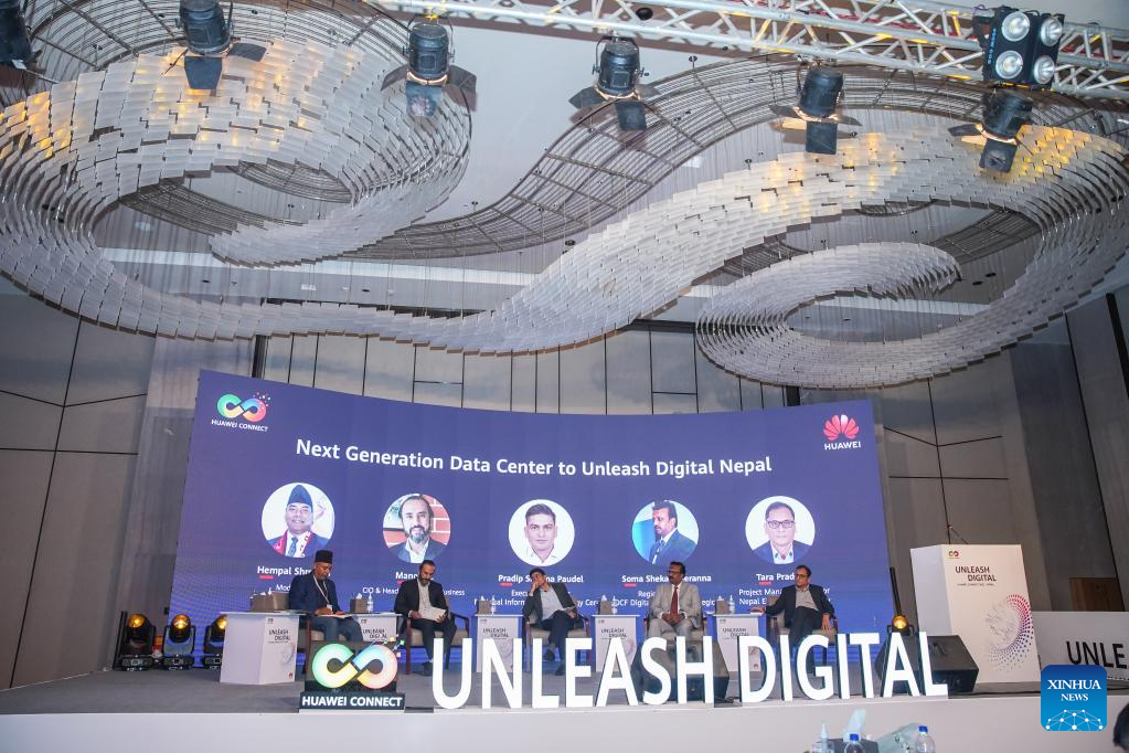 A panel discussion themed "Next Generaton Data Center to Unleash Digital Nepal" is held during Huawei Connect 2022 in Kathmandu, Nepal, Dec. 20, 2022. (Photo by Hari Maharjan/Xinhua)