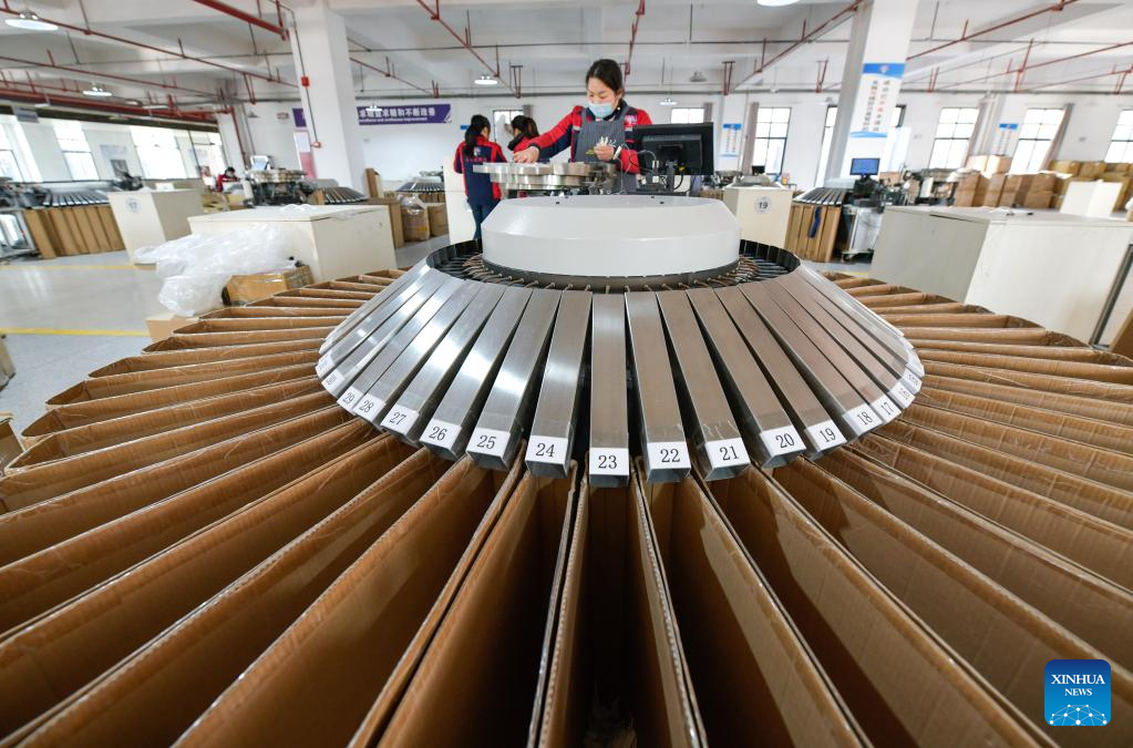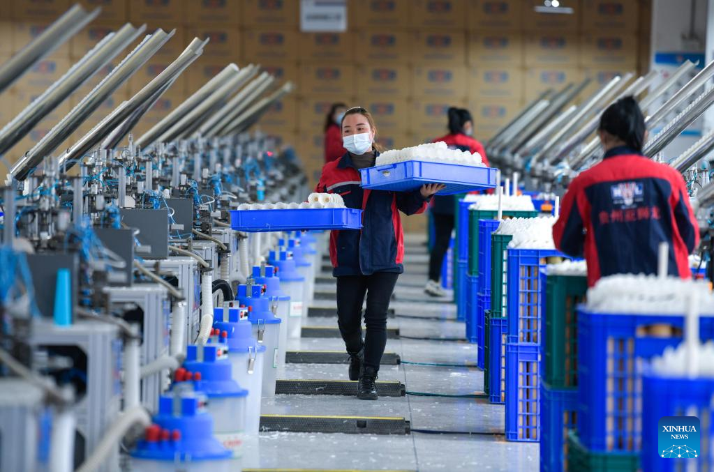 Workers work at a badminton shuttlecock enterprise in Jinping County in Qiandongnan Miao and Dong Autonomous Prefecture, southwest China's Guizhou Province, Dec. 19, 2022. (Xinhua/Yang Wenbin)