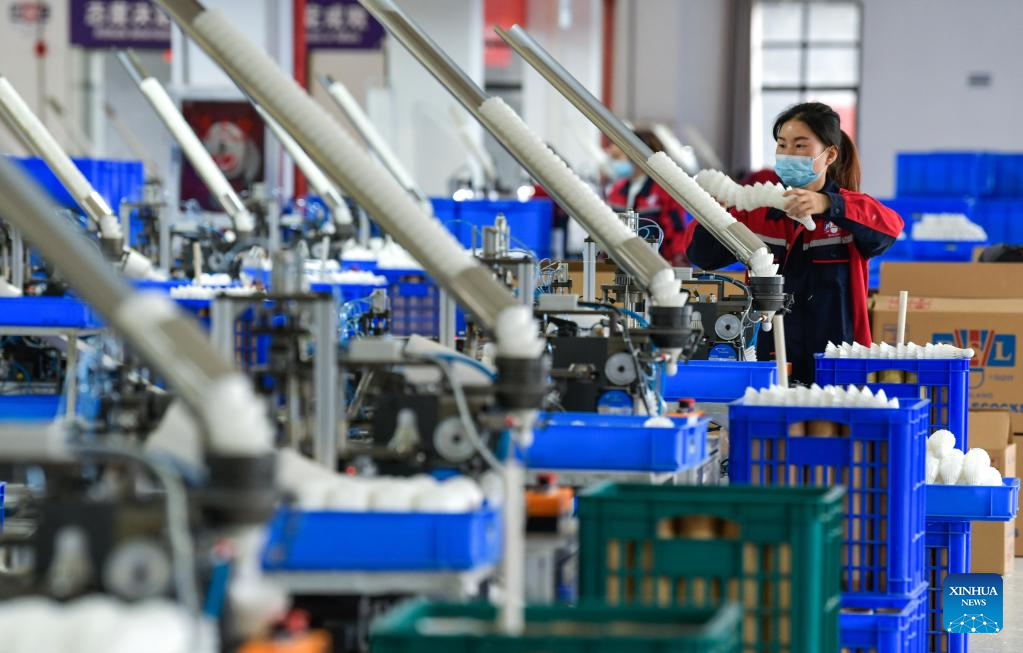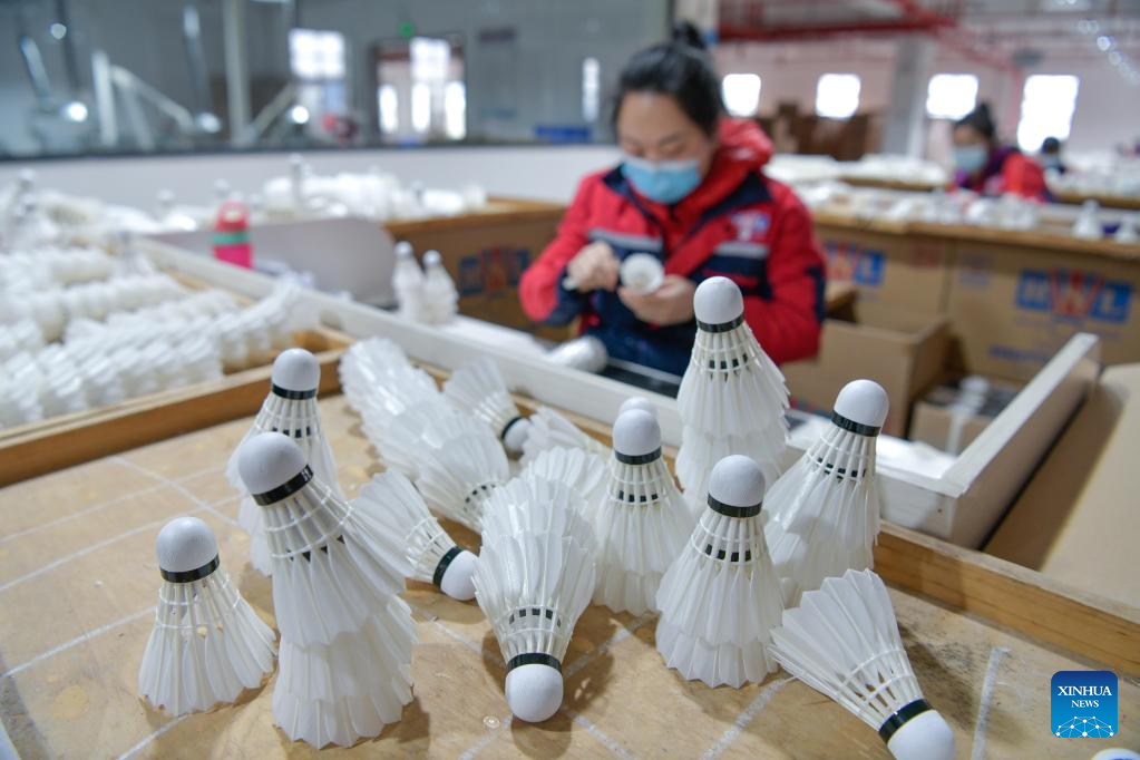 A worker checks products at a badminton shuttlecock enterprise in Jinping County in Qiandongnan Miao and Dong Autonomous Prefecture, southwest China's Guizhou Province, Dec. 19, 2022. (Xinhua/Yang Wenbin)