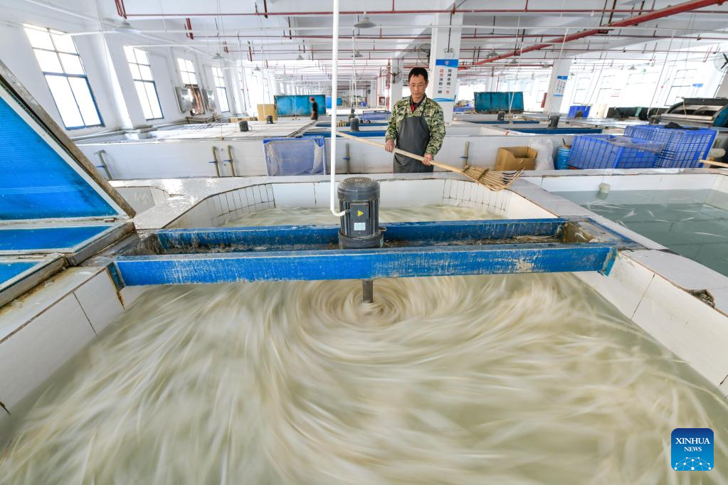 A worker carries shuttlecocks at a badminton shuttlecock enterprise in Jinping County in Qiandongnan Miao and Dong Autonomous Prefecture, southwest China's Guizhou Province, Dec. 19, 2022. (Xinhua/Yang Wenbin)