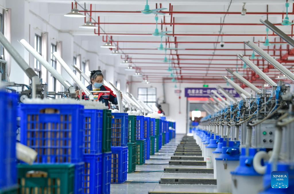 A worker works at a badminton shuttlecock enterprise in Jinping County in Qiandongnan Miao and Dong Autonomous Prefecture, southwest China's Guizhou Province, Dec. 19, 2022. (Xinhua/Yang Wenbin)