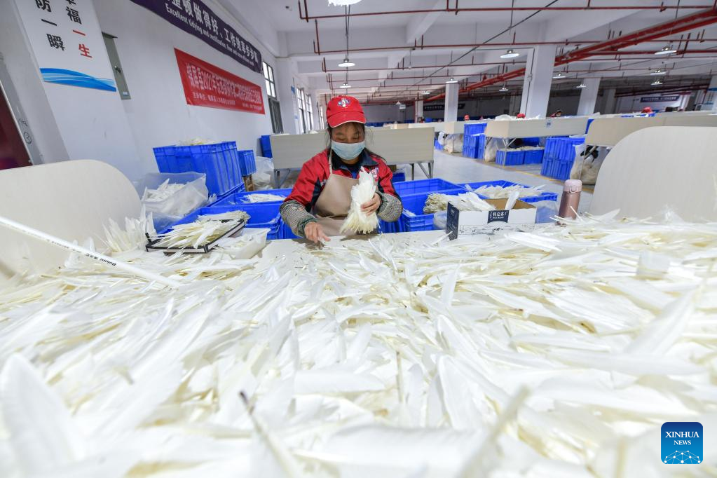 A worker cleans feathers at a badminton shuttlecock enterprise in Jinping County in Qiandongnan Miao and Dong Autonomous Prefecture, southwest China's Guizhou Province, Dec. 19, 2022. (Xinhua/Yang Wenbin)