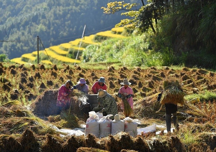 Rice is threshed in the Shangbao Terraces in Chongyi county, Ganzhou, east China's Jiangxi province, October 2022. (People's Daily Online/Shi Yu)