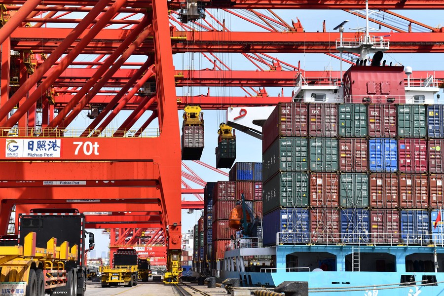 Trucks wait to load containers at a container terminal in Rizhao, east China's Shandong Province, March 28, 2022. (Xinhua/Guo Xulei)