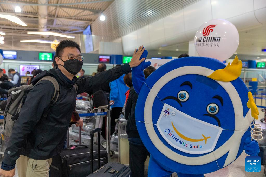 Passengers were welcomed by Air China and AIA officials with balloons, desserts and a mascot during an event at the check-in area.
