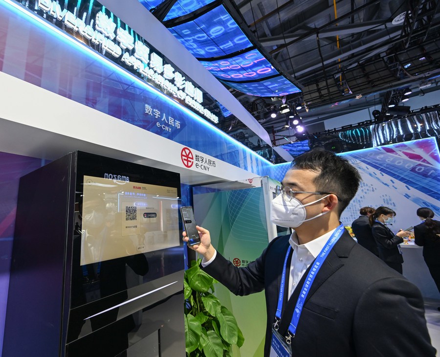 A staff member demonstrates the payment with China's digital yuan, or the e-CNY, during the first Global Digital Trade Expo in Hangzhou, east China's Zhejiang Province, Dec. 12, 2022. (Xinhua/Xu Yu)