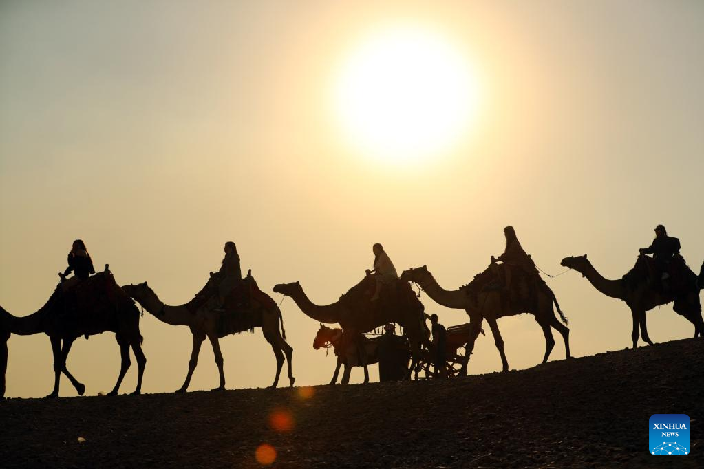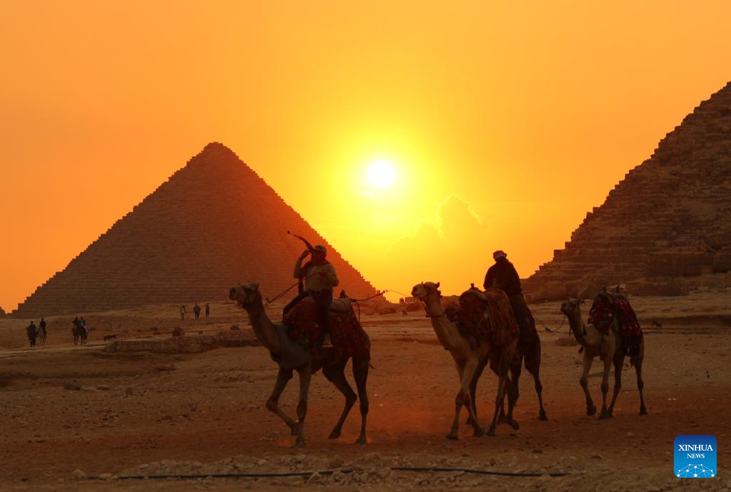 People ride camels at sunset at the Giza Pyramids scenic spot in Giza, Egypt, on Dec. 22, 2022. (Xinhua/Sui Xiankai)