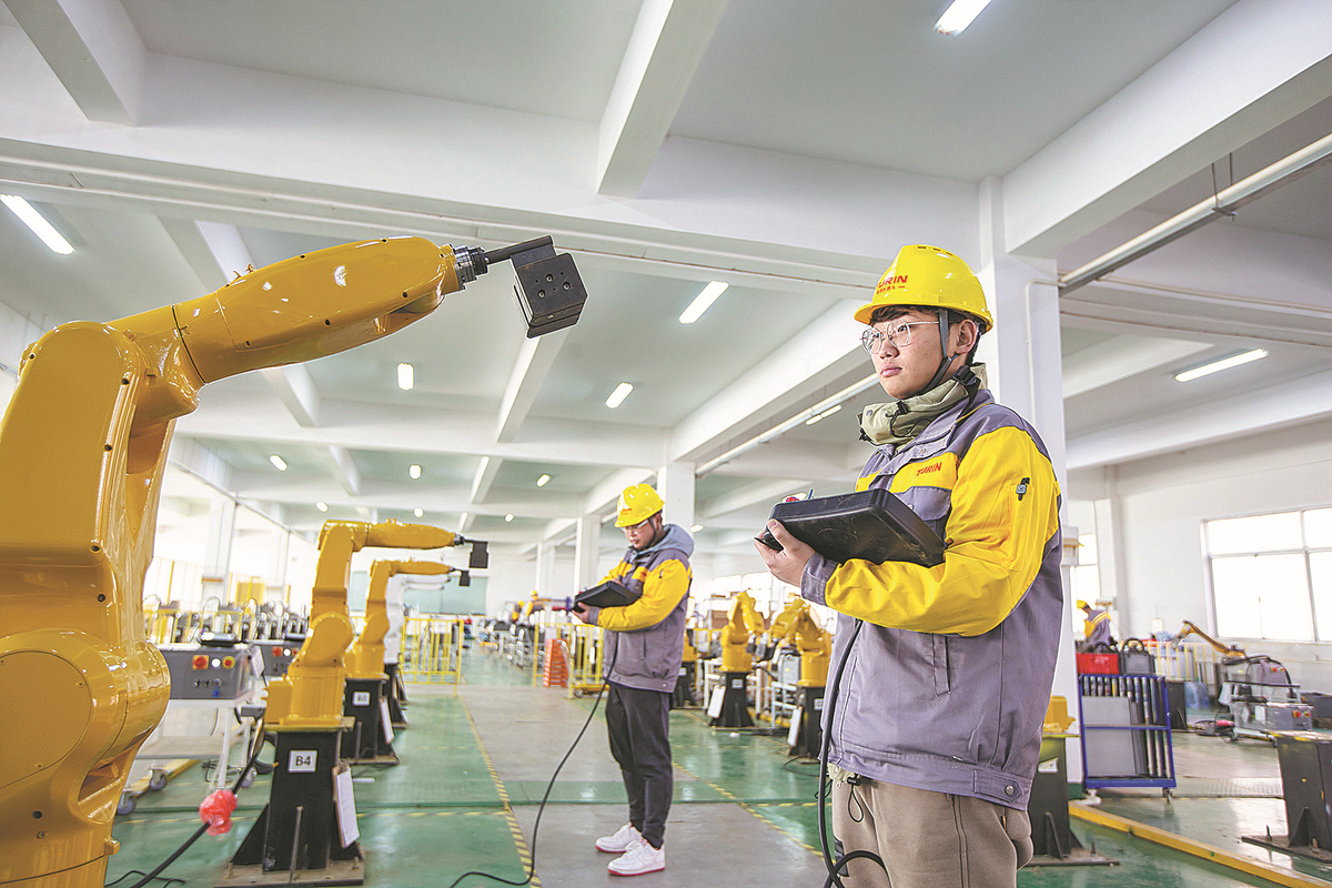 Technicians check industrial robots at a manufacturer in Haian, Jiangsu province. [ZHAI HUIYONG/FOR CHINA DAILY]
