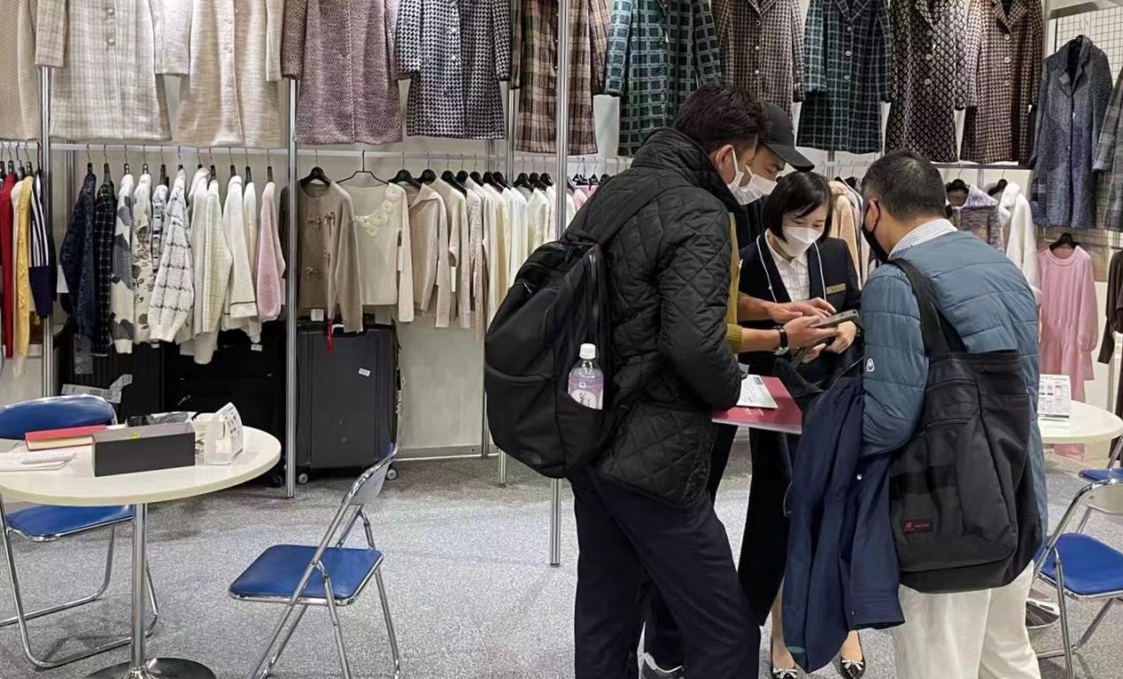 Representatives from clothing companies in Jiaxing, east China’s Zhejiang Province, communicate with clients during the Asian Fashion Fair (AFF) in December 2022. (People’s Daily Online/courtesy of the interviewee)