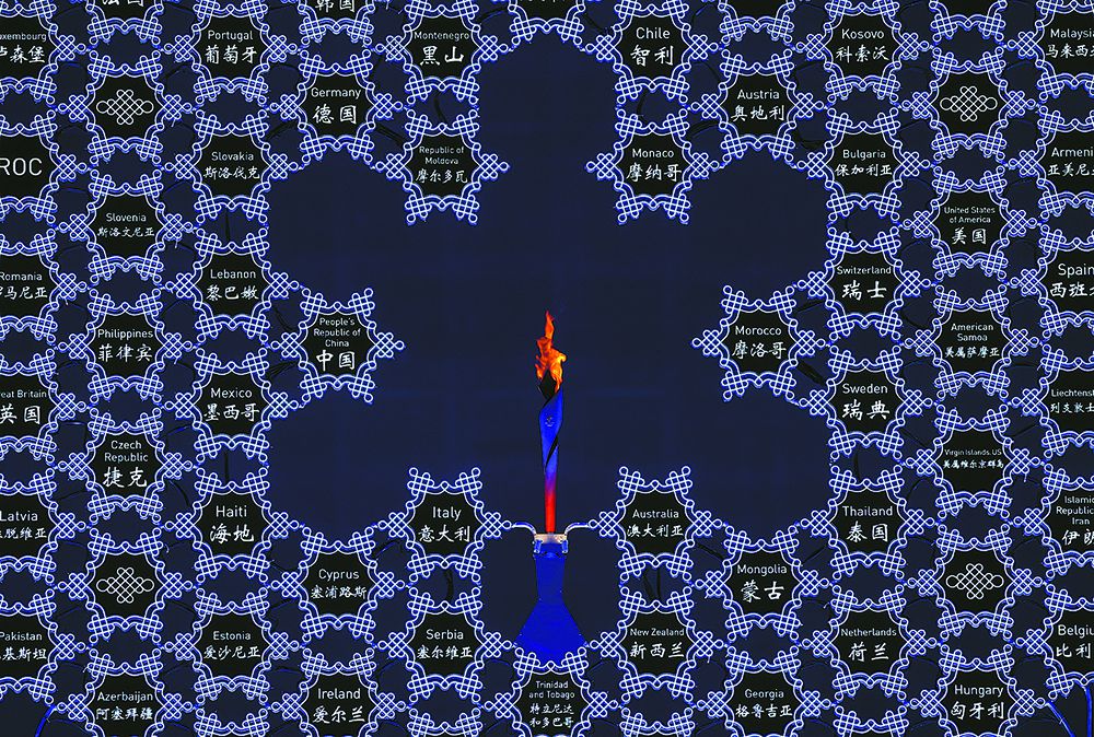 An intricately designed cauldron holds the Olympic flame during the opening ceremony of the Beijing 2022 Olympic Games at the National Stadium on Feb 4. [Photo/Xinhua]