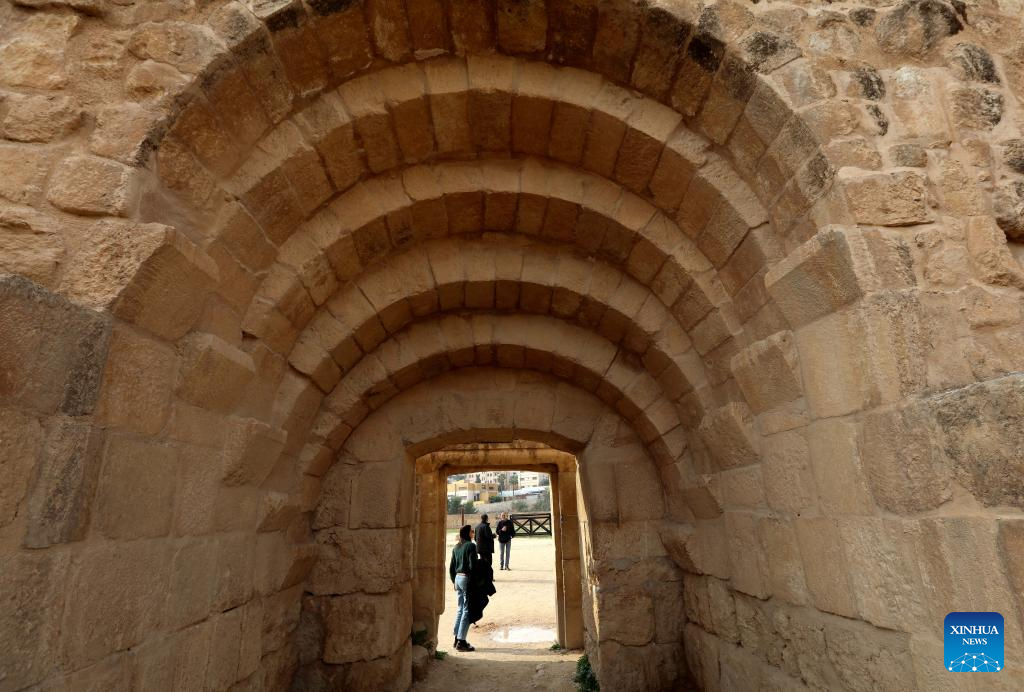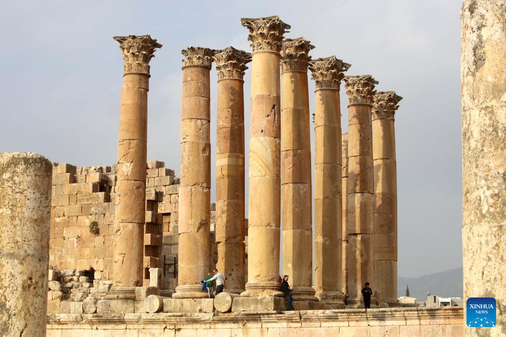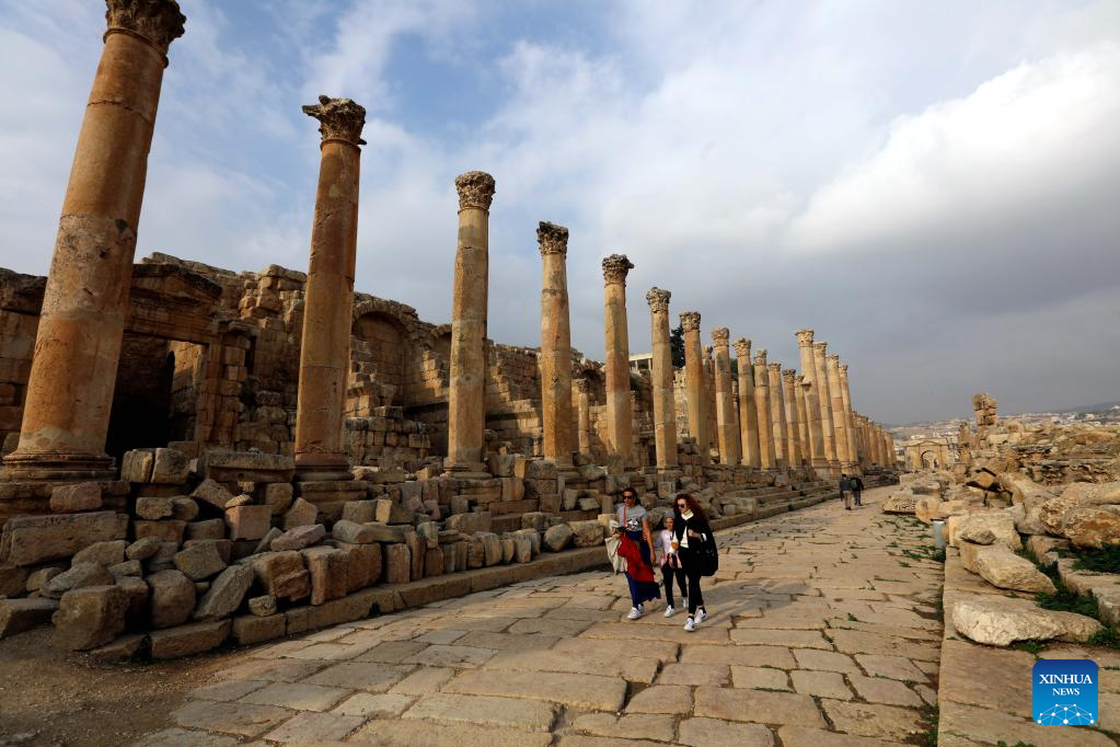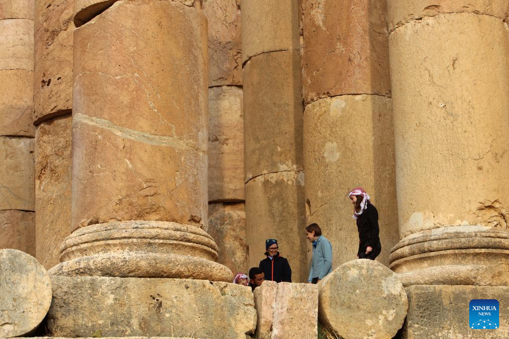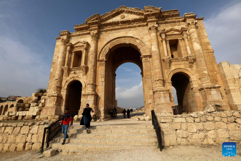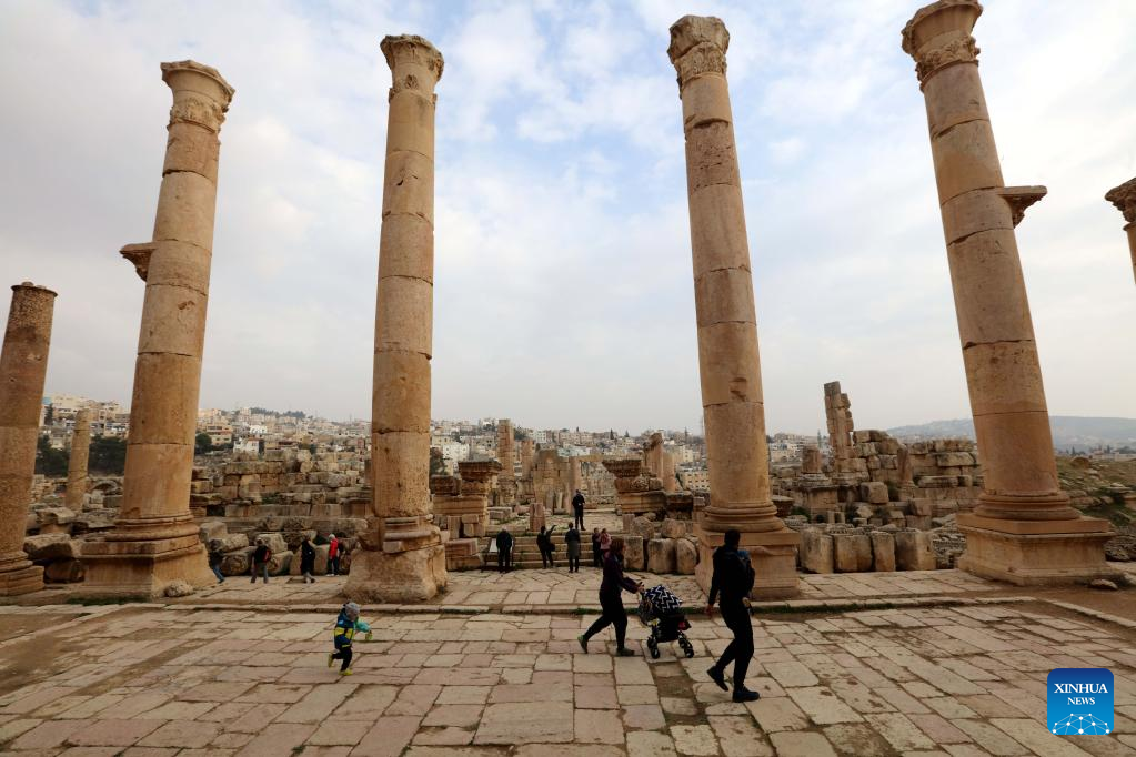 Tourists visit a Roman archeological site in Jerash, Jordan, on Dec. 23, 2022. (Photo by Mohammad Abu Ghosh/Xinhua)