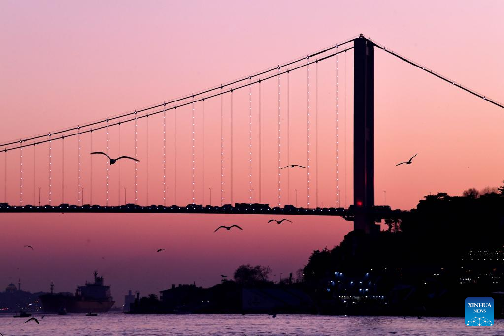 This photo taken on Dec. 22, 2022 shows the Bosporus Strait in sunset glow in Istanbul, Trkiye. (Xinhua/Shadati)