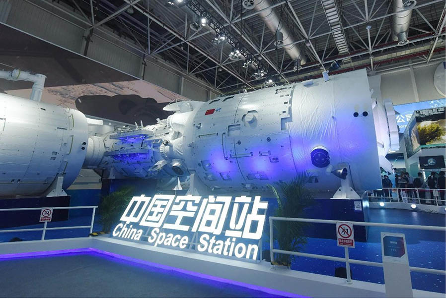 Photo shows the model of China's space station combination showcased at the 14th China International Aviation and Aerospace Exhibition in Zhuhai, south China's Guangdong province, Nov. 9, 2022. (Photo by Long Wei/People's Daily Online)