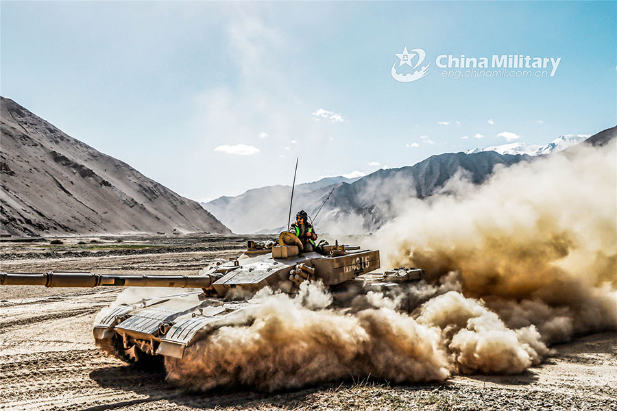 A main battle tank attached to a brigade under the PLA 77th Group Army rumbles through a mound of dust during a field maneuver training exercise on December 4, 2022. (eng.chinamil.com.cn/Photo by Huang Tengfei and Tang Chaocheng)