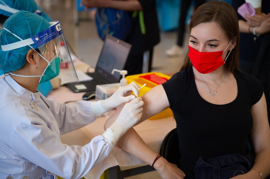 A health worker administers a dose of COVID-19 vaccine to Anna Lujza Honecz from Hungary at a vaccination site in Tsinghua University, Beijing, capital of China, April 3, 2021. (Xinhua/Chen Zhonghao)
