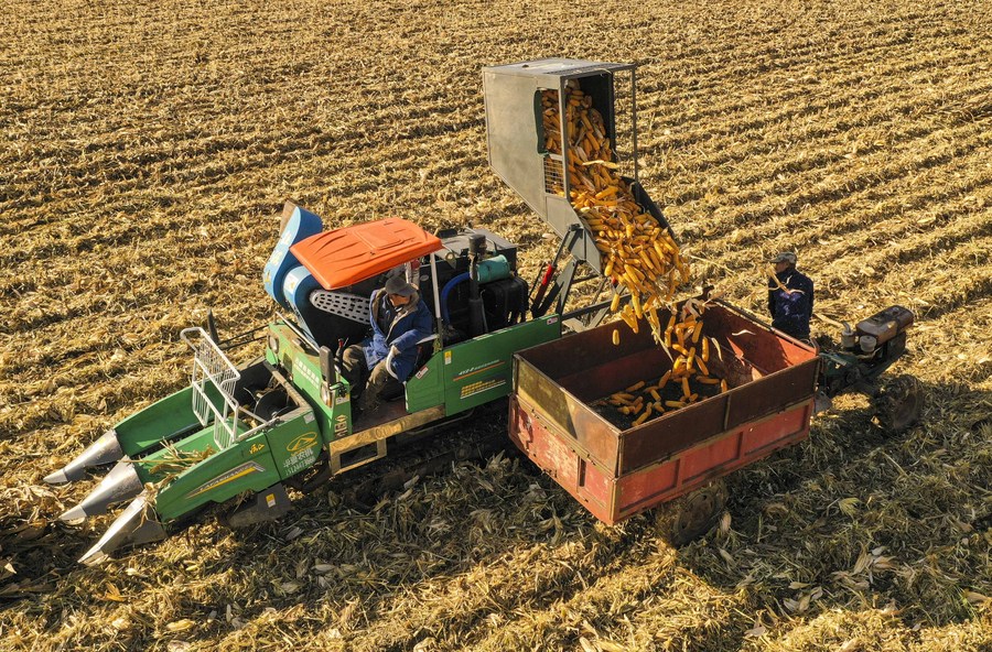 Aerial photo taken on Oct. 10, 2021 shows farmers harvesting corns in Huapichang Town of Jilin City, northeast China's Jilin Province. (Xinhua/Xu Chang)