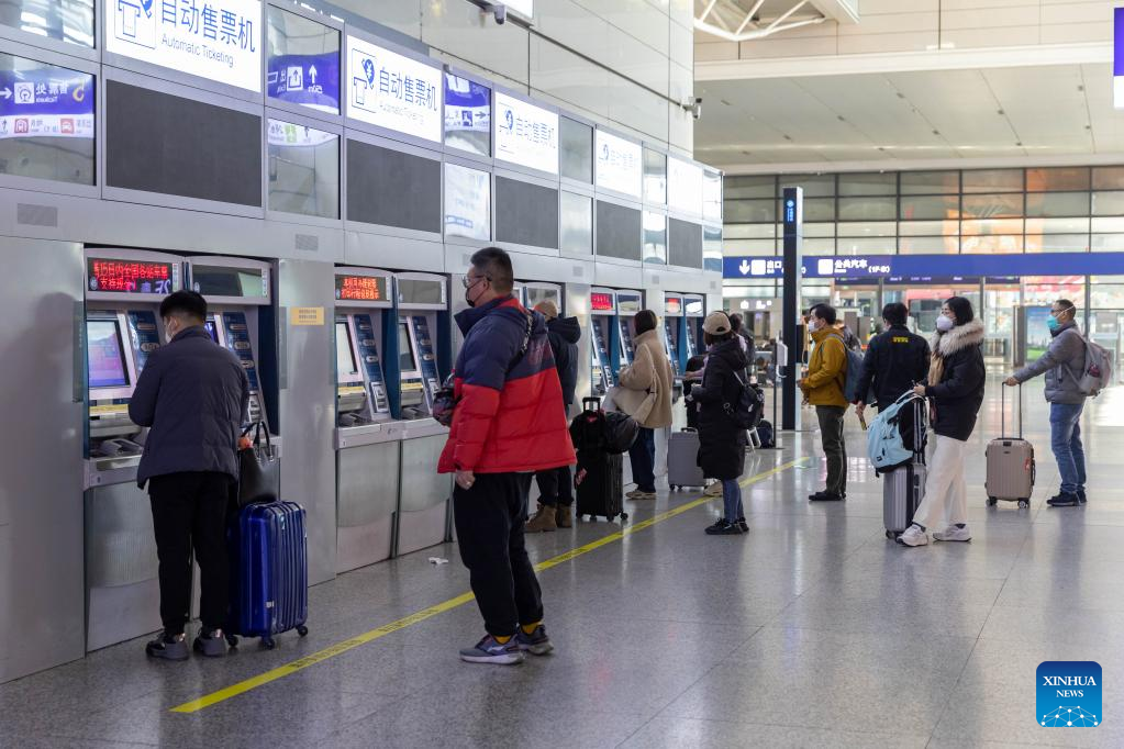 Travellers use automatic ticketing machines at the Shanghai Hongqiao Railway Station in east China's Shanghai, Dec. 24, 2022. (Xinhua/Wang Xiang)